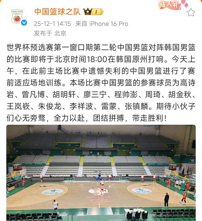 北京时间2025年12月1日消息。今天下午14点15分,中国篮球之队官网宣布:晚上6点和韩国男篮的第二场比赛,12人名单延续之前首回合比赛的阵容,没有改变。尽管中国男篮队长赵睿随队来到了韩国,但是没有进入到大名单之中。
